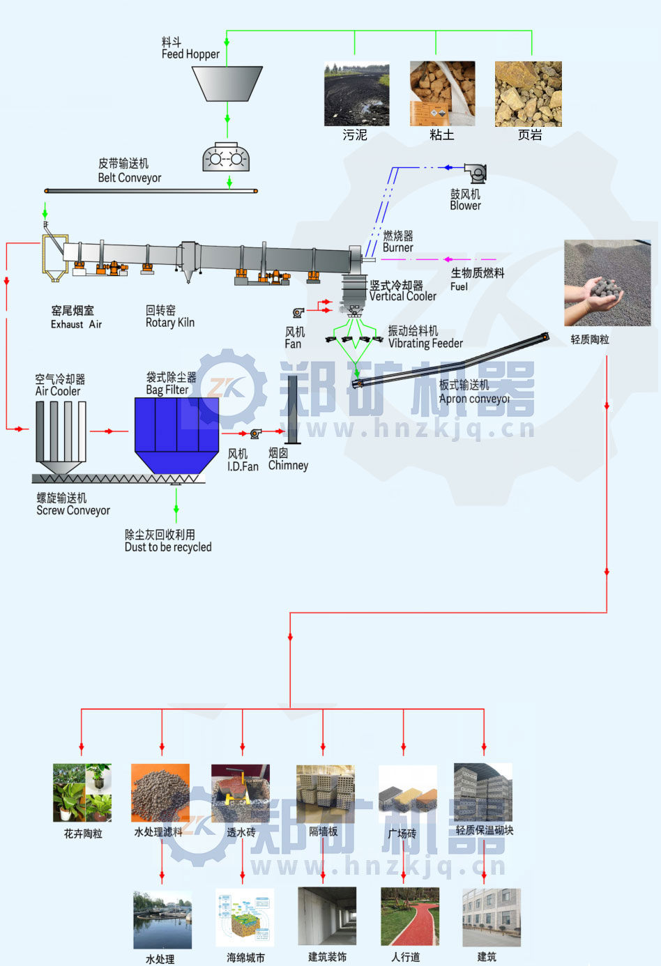 节能环保:先进的生产工艺,使得建筑陶粒的生产达到提高产品质量和节能降耗的目的, 单条生产线能力大,热耗低,配套先进的袋收尘器,满足30mg/Nm3的严格的排放要求。